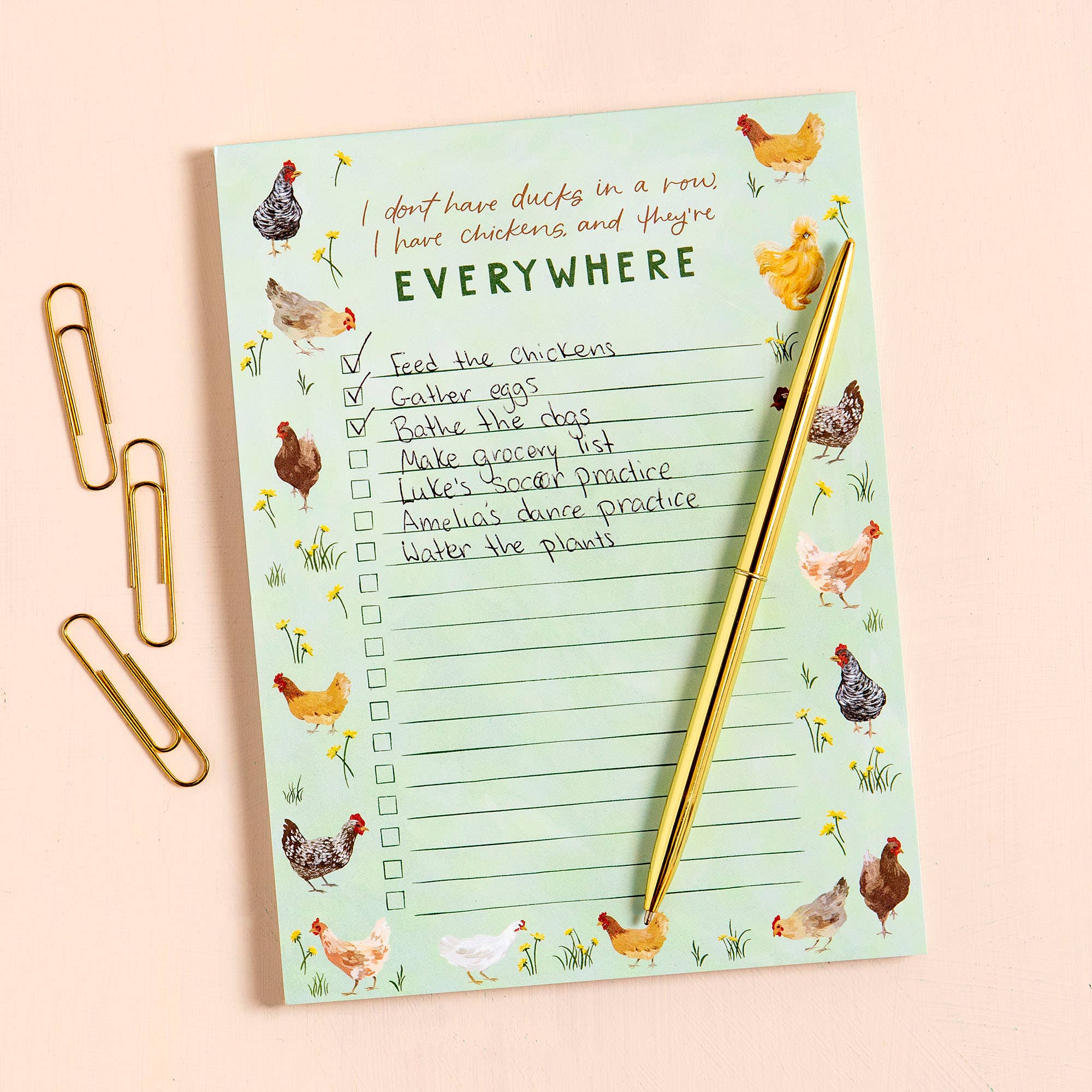 Keep track of your to-dos with a touch of farmhouse charm using the Chicken Meadows Notepad! Perfect for those who love a bit of country fun, this notepad features charming chicken illustrations and plenty of space for your lists. Ideal as a gift for animal lovers, chicken enthusiasts, or anyone who needs a little help staying organized, this notepad is both practical and playful. Whether it's for grocery lists, daily tasks, or reminders, brighten up your day with these adorable chickens pecking around your notes.
