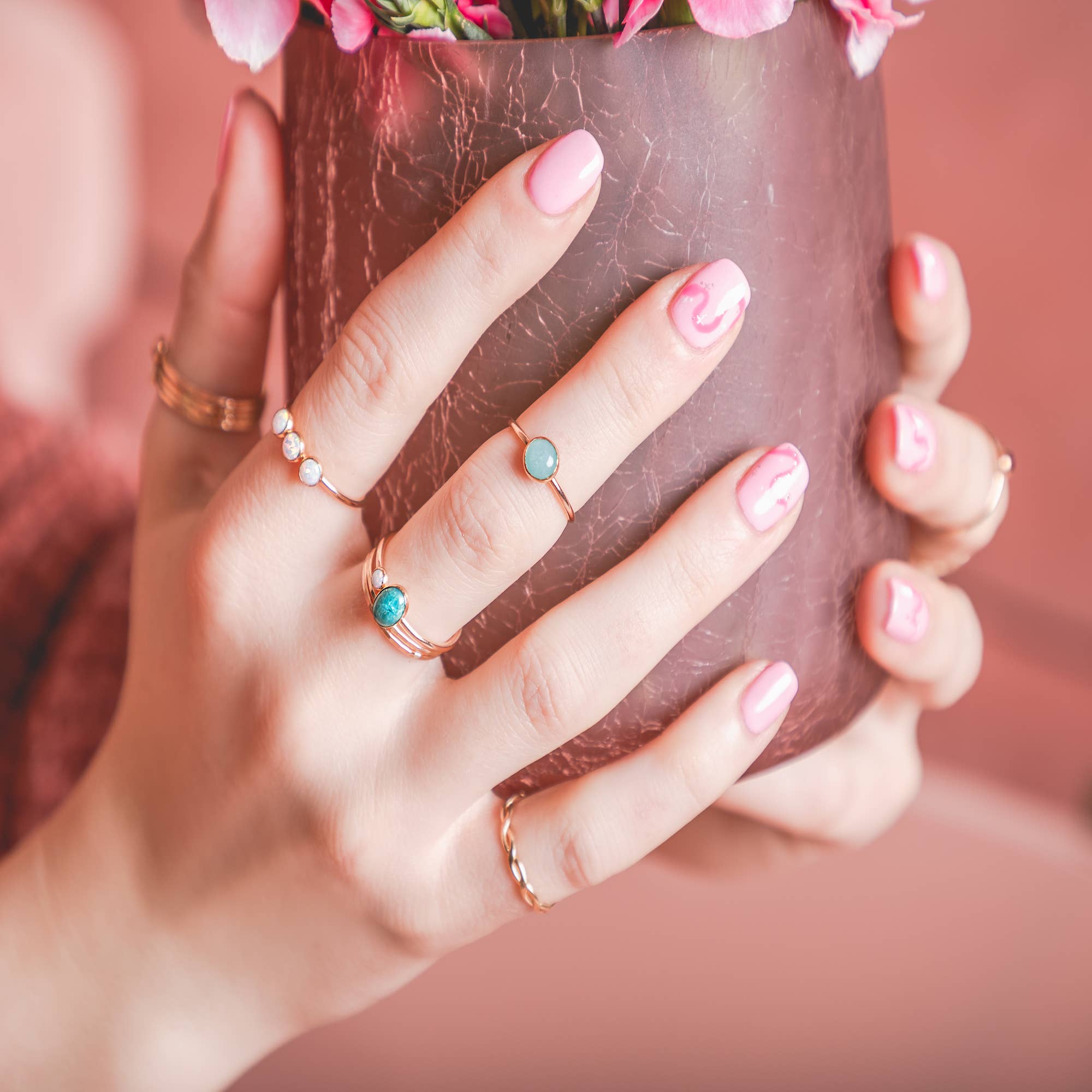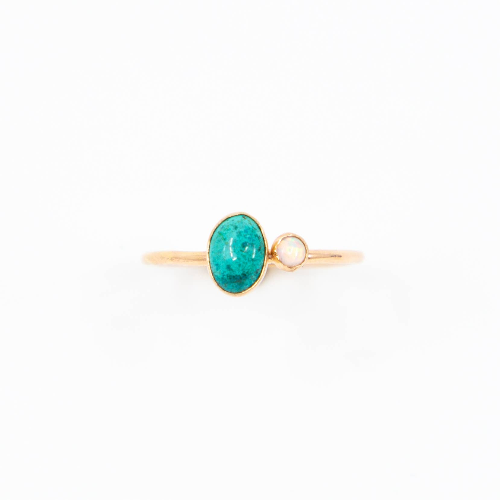 Chrysocolla, is commonly associated with tranquility, peace, intuition, patience and unconditional love. She’s known as a healing stone among Native American cultures where it has been used to strengthen the body's resistance to illness and emotional duress. Opal is an emotional stone and reflects the mood of the wearer while intensifying emotions and releases inhibitions. She greatly encourages both freedom and independence. Hand-formed, this ring is set in a bezel style in 14k goldfill.