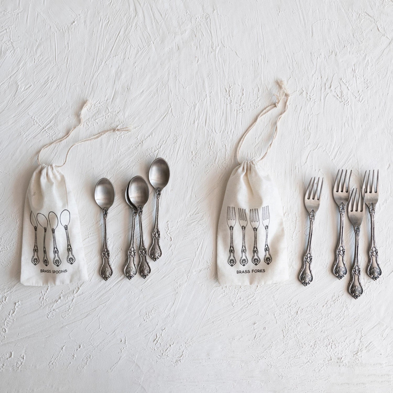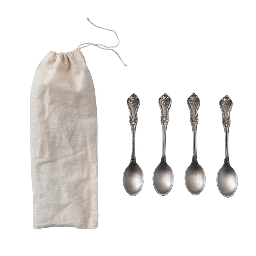 Embossed Brass Spoons, Antique Silver Finish, Set of 4 in Printed Drawstring Bag