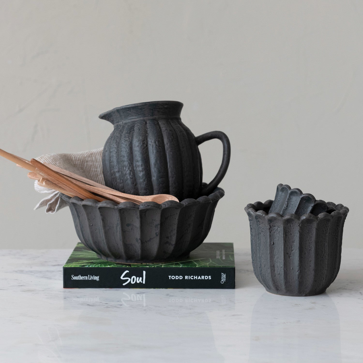 This handcrafted black stoneware pitcher combines a detailed fluted design with a weathered, distressed finish to evoke rustic elegance. Its substantial 2.5-quart capacity makes it both a functional piece for serving beverages or holding water, and an artistic accent to your table setting or kitchen display. Measuring 8 inches long by 6 inches wide and 7.5 inches high, this pitcher fits seamlessly into a variety of interior styles, from farmhouse to contemporary. Carefully designed craftsmanship ensures each piece adds texture and character, allowing you to personalize your space with distinctive, intentional décor.