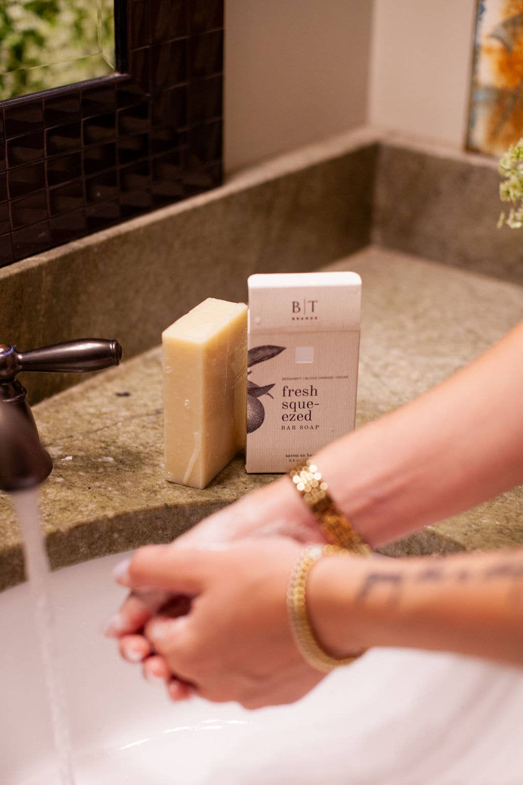 Bring the sunshine straight to your shower with our Fresh Squeezed Bar Soap! Bursting with zesty bergamot, juicy blood orange, and a grounding hint of cedar, this playful citrus blend feels like a refreshing sip of freshly squeezed juice on a warm day. It’s bright, cheerful, and just the pick-me-up your skin (and mood) needs. Features: Handcrafted with natural oils, this rich lathering bar cleanses gently while nourishing your skin. Long-lasting and perfect for daily use, it delivers an energizing fragrance that keeps you feeling fresh and vibrant all day.