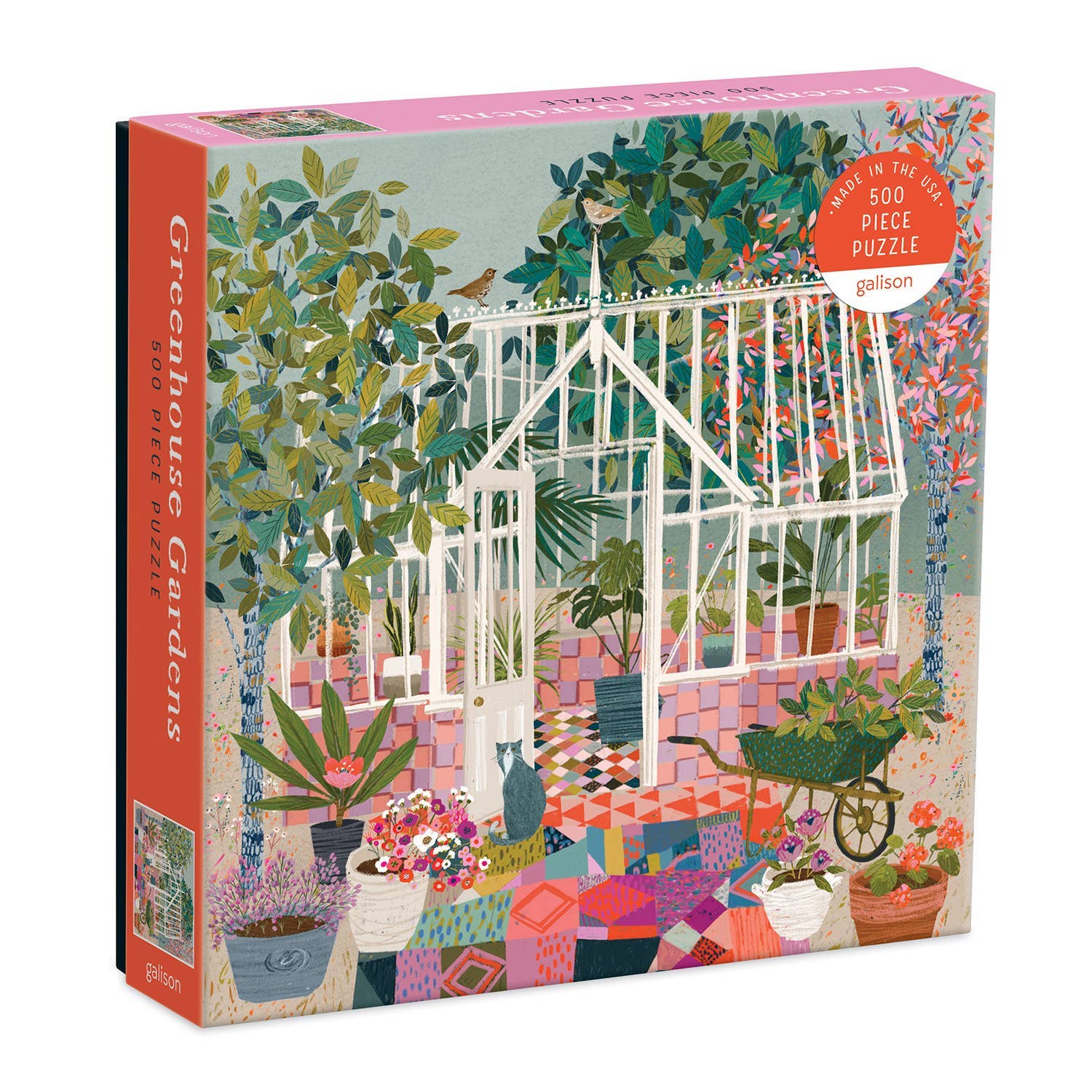 The Greenhouse Gardens 500 Piece Jigsaw Puzzle from Galison features a charming and colorful illustration of a gardener's greenhouse. Galison puzzles are packaged in matte-finish sturdy boxes, perfect for gifting, reuse, and storage. - 500 pieces, random cut - Box Size: 8 x 8 x 1.5" - Puzzle Size: 19 x 19" - Includes Puzzle Insert - Manufactured in USA