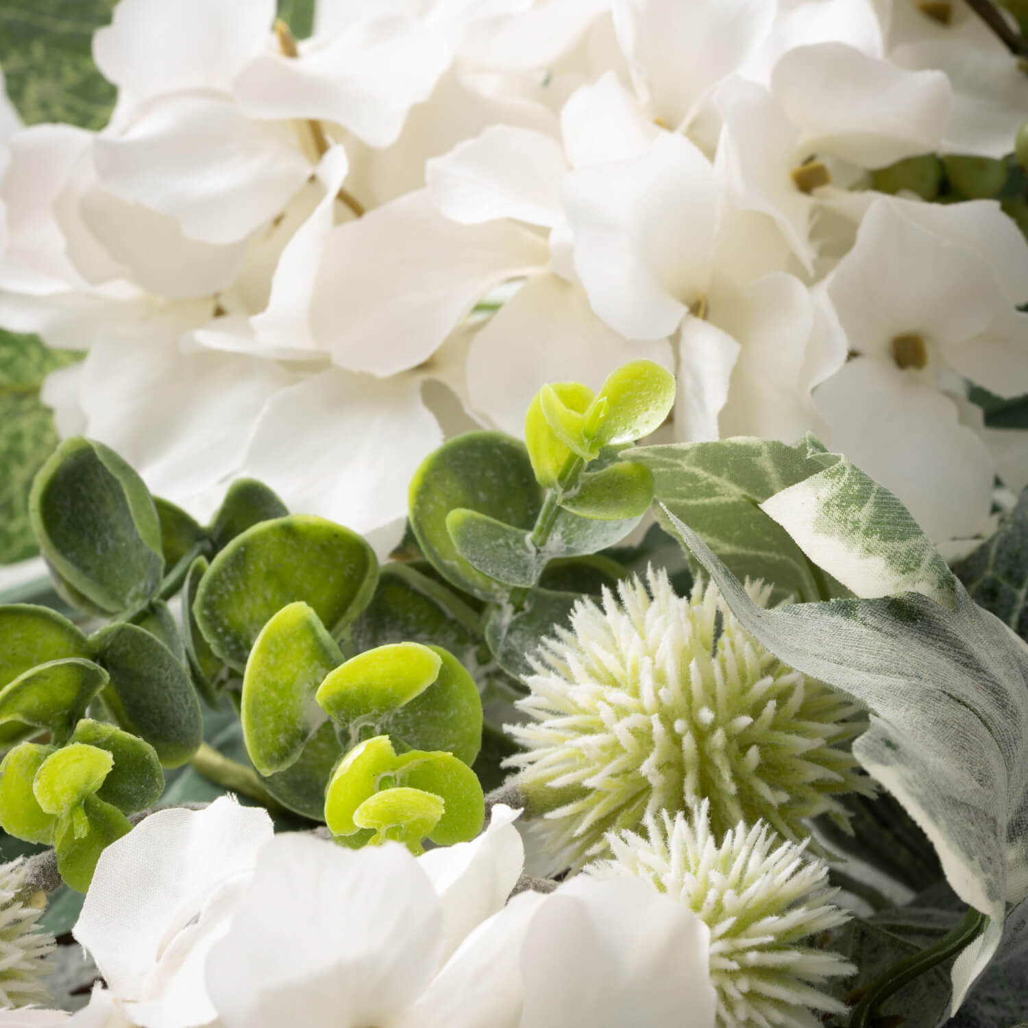 Light, airy, and sophisticated, elegance exudes from this lovely floral collection. Off-setting the various shades of foliage, is lively berries, lush greens, and to top it off -- hydrangeas.