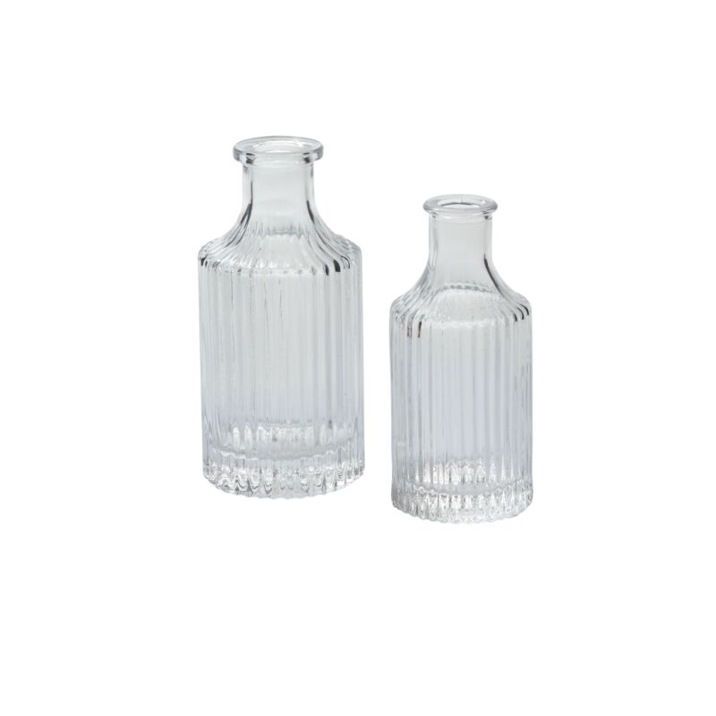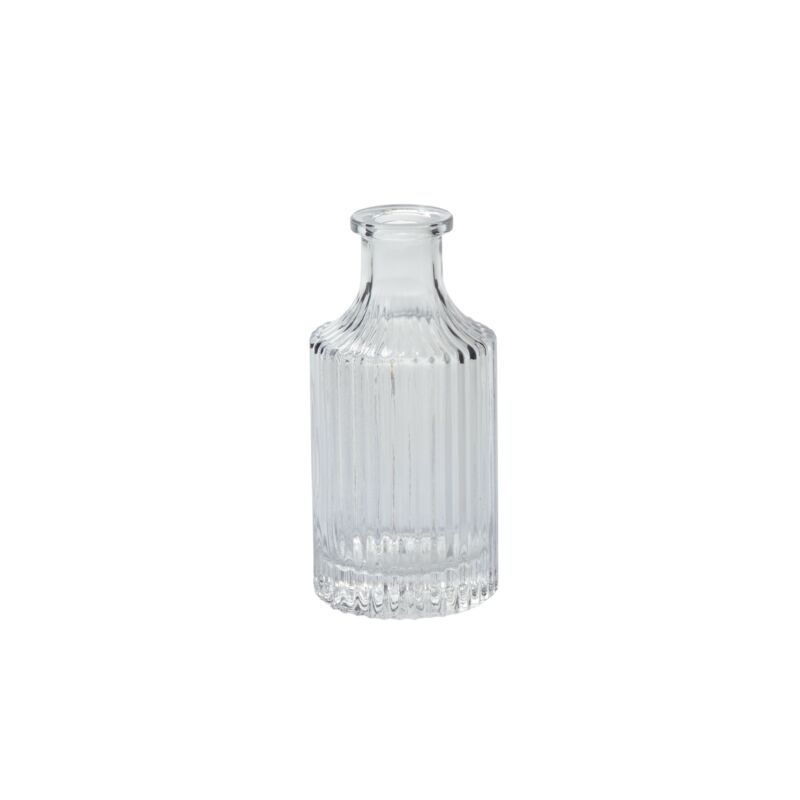 Featuring a bottle shape, glass material, & vertical ridging, the clear & simple silhouette of the Karina Budvase offers a timeless look to any wedding or event or everyday tablescape. Perfect for adding to your floral essentials collection of budvases, this versatile vessel layers beautifully with our other glassware for a cohesive scene or makes a stunning standalone piece with a few stems.
