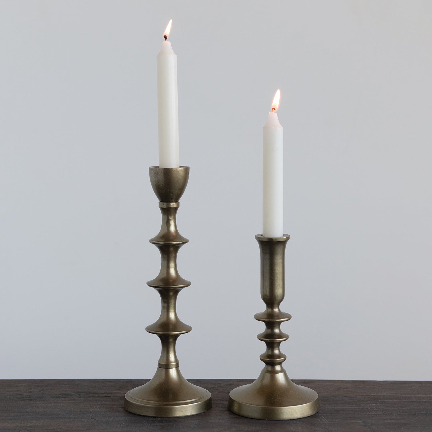 This candle holders is a stunning antique gold color. The patina has a worn and vintage look, as if you picked up this unique candle holder at a local antique store. Both candle holders have fluted shapes with rounded details. The candle holders hold standard taper candles.