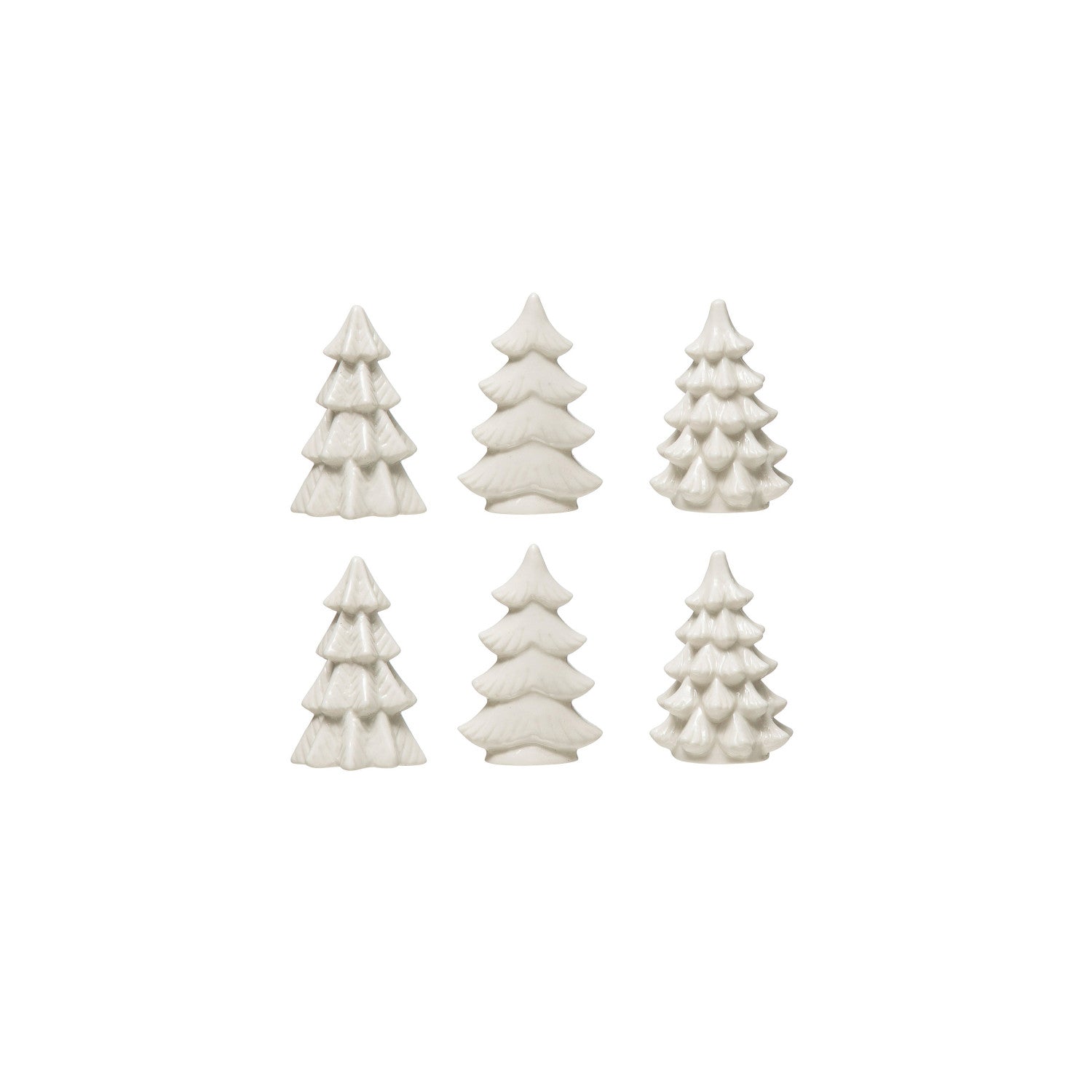 This set of six white stoneware tree figurines can be the perfect addition to this season's holiday decor. Place on a table or shelf or add them to a centerpiece for a bit of extra flair. Mingle with other holiday figurines like a snowman, Santa or miniature buildings