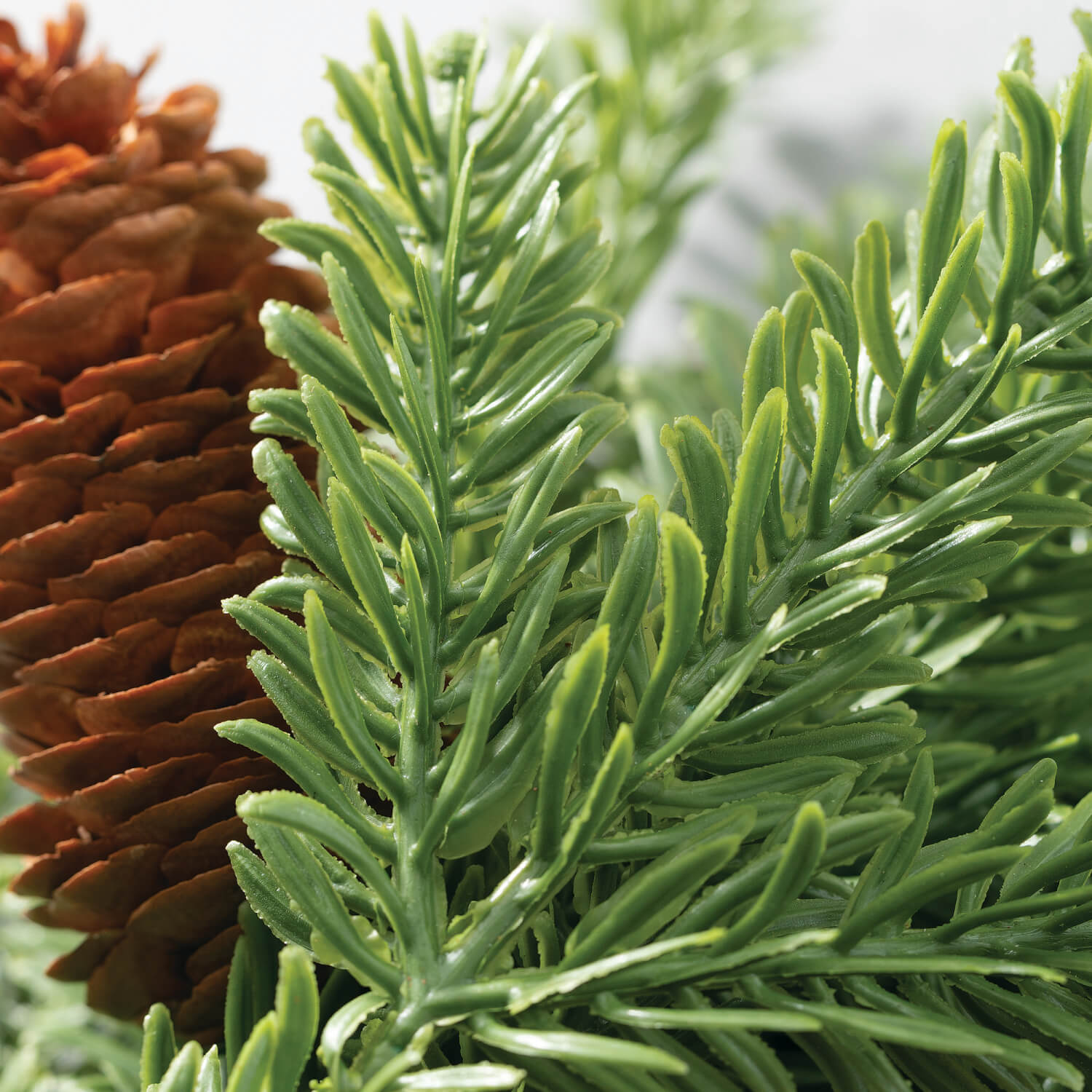 A trio of pine branches come together to be hand-tied by jute rope to create this simple holiday favorite. Plenty of vivacious greens are perfectly accented with a trio of realistic-looking pine cones.