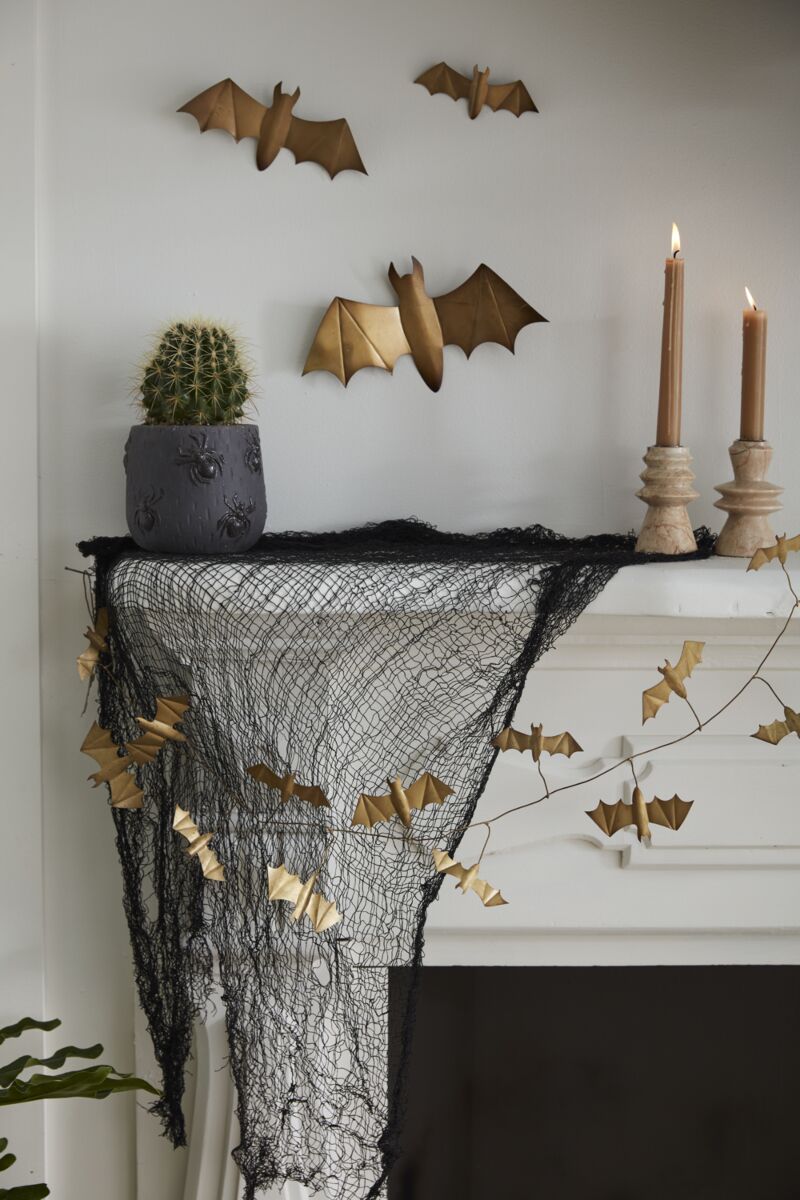 Enhance your space with the Winged Bats wall décor, a curated set of flying bat figures crafted from gold sheet metal. Perfect for mantles and walls, these adjustable bats create the illusion of flight. This trio features three distinct sizes, designed to be hung and arranged for a layered, sophisticated spooky ambiance.