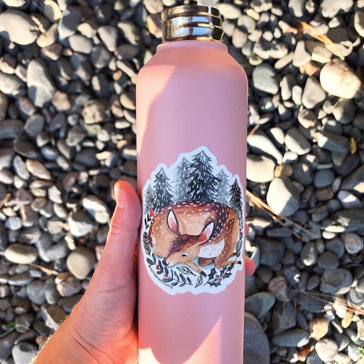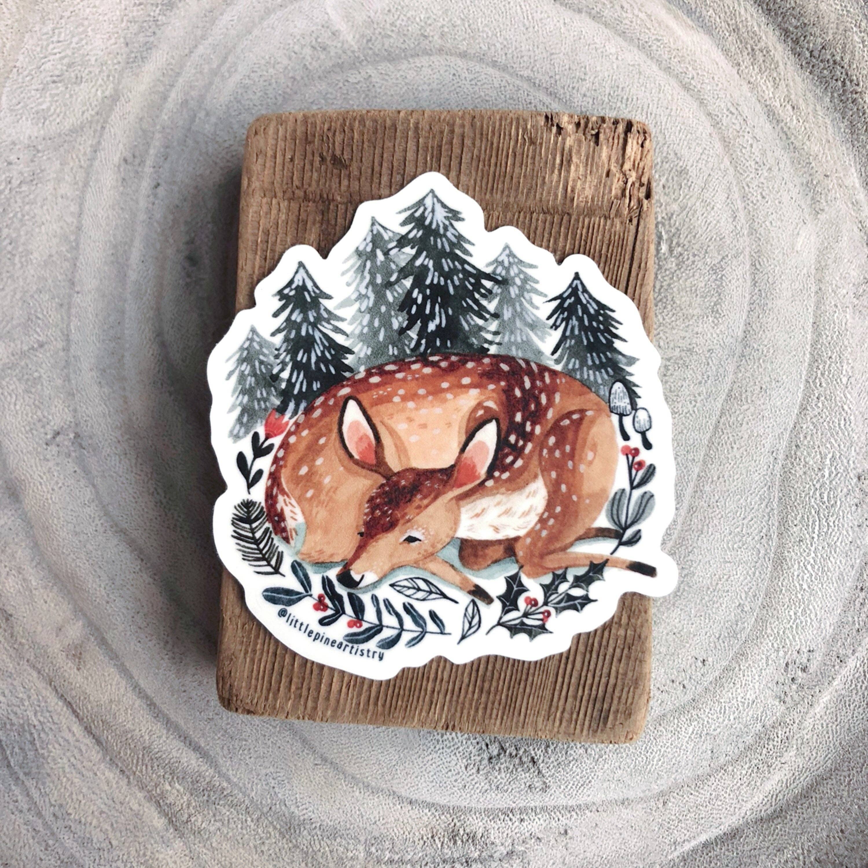 This Winter Fawn sticker is based on an original watercolor painting that portrays a cute young fawn nestled in some brush with a dusting of snow. It would be a great fit on a holiday tumbler or Christmas calendar. Might also make a great gift for a friend who loves cute little fawns. Premium laminated die cut vinyl sticker with a matte finish. High quality production - it holds up to water very well making it perfect to use on water bottles, lunchboxes, cars, cell phone cases, cargo containers, coffee tumblers, laptops and anywhere else that it might bring you joy! Sticker measurements: 3.5" tall by 3.25" wide